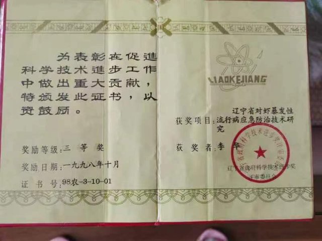 “辽宁省对虾爆发性流行病应急防治技术研究”获辽宁省科技进步三等奖