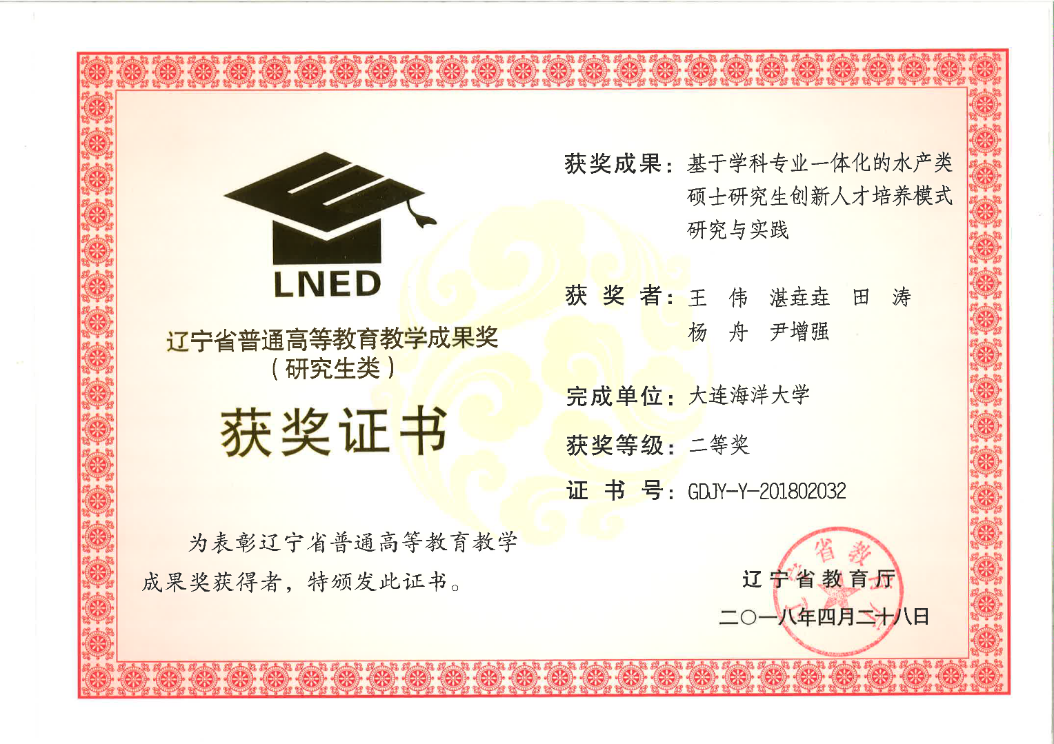 “基于学科专业一体化的水产类硕士研究生创新人才培养模式研究与实践”获辽宁省教学成果(研究生类)二等奖
