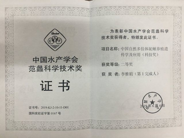 “中国自然多倍体泥鳅养殖遗传学及应用”获第四届中国水产学会范蠡科学技术奖二等奖