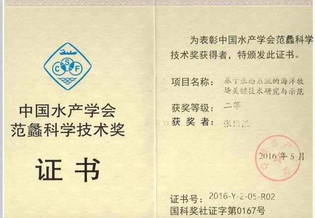 “基于生态系统的海洋牧场关键技术研究与示范”获中国水产学会范蠡科学技术二等奖