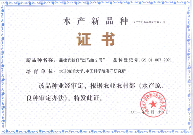 菲律宾蛤仔“白斑马蛤”通过水产新品种审定