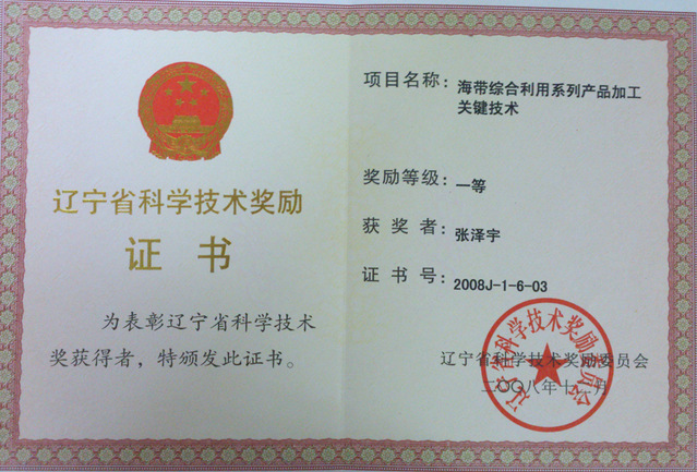 “海带综合利用系列产品加工关键技术”获辽宁省科学技术一等奖