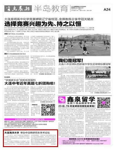 10月11日,《半岛晨报》A24版以“花都影视 举办中日韩研究生学术论坛”为题对辽宁省海洋水产领域研究生创新与交流中心主办、我校承办的“2016中日韩研究生学术论坛”进行了专题报道。