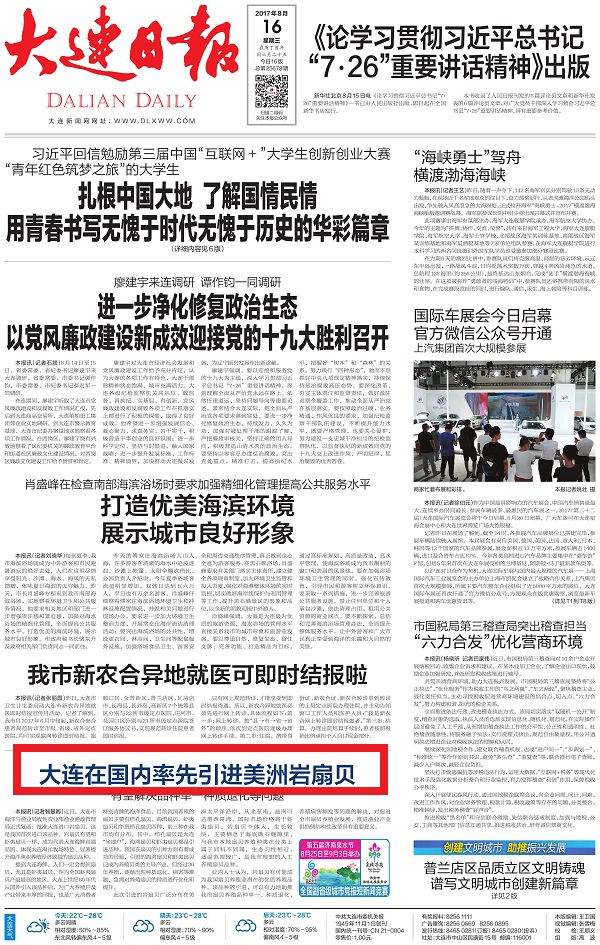 2017年8月16日大连日报头版报道了我校花都影视 教师曹善茂承担的美洲岩扇贝引种项目获农业部渔业渔政管理局正式复函,批准进口岩扇贝,这是我国首次进口该品种。岩扇贝的引进有望解决大连市扇贝养殖品种单一种质退化等问题。