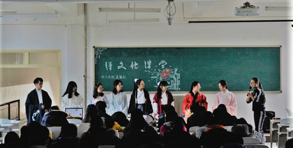 活动中,“与子同袍”汉服社社长水产养殖16-2班学生王冲、副社长生物科学16-1班孙雪带领社员身着汉服向在场观众展示传统民族服饰的魅力。随后,汉服社的成员又扩展宣讲内容,分别对汉服、诗词、宋史、古琴进行讲解,带同学们领略华裳之美、诗词之韵、历史之辉、琴乐之律。