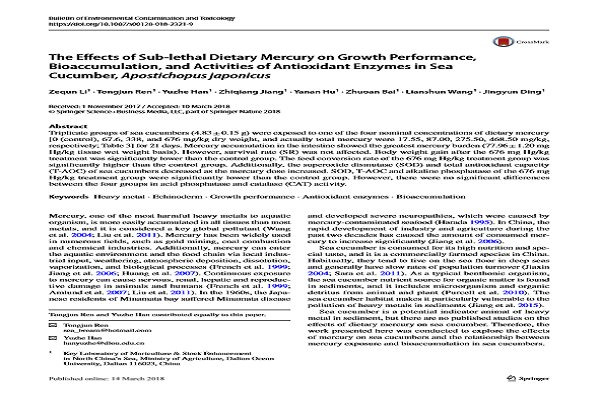 2018年3月14日,花都影视 水产养殖学2014-2班学生李泽群撰写的论文《The Effects of Sub-lethal Dietary Mercury on Growth Performance, Bioaccumulation, and Activities of Antioxidant Enzymes in Sea Cucumber, Apostichopus japonicas 》被《Bulletin of Environmental Contamination and Toxicology 》杂志接收,该杂志为SCI收录期刊,IF为1.412。