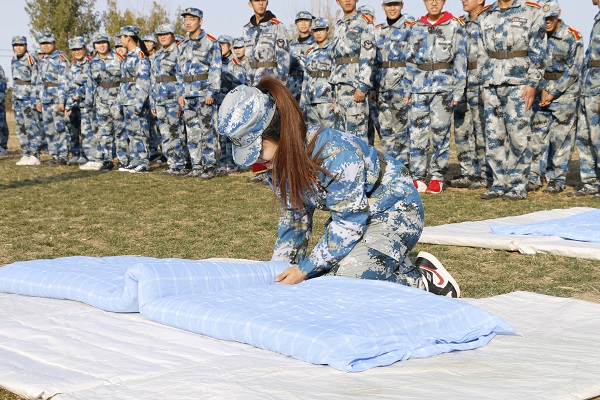 首先,各连教官带领学生们开展体能、队列训练,对军训内容进行了强化练习。随后,在休息时间组织了“叠被子”大赛,经过激烈比拼,评选出六名“学长计划”内务标兵,并由辅导员孟丽婷为获奖学生颁奖。最后,各连教官同学生们一起开展了“十人九足”、“丢手绢”等互动活动,使学生们在紧张的训练之余,能够在娱乐中互相了解并增进集体凝聚力。