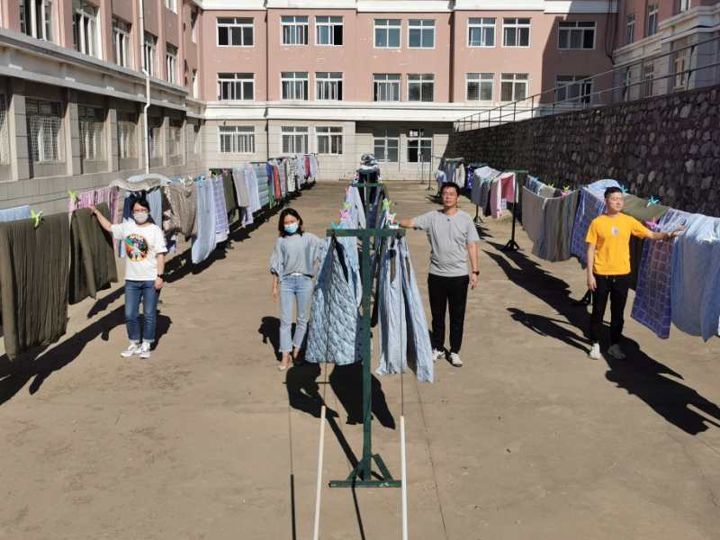 教工党员们为学生宿舍打开门窗通风换气,确保室内空气流通、干爽,清理了易腐食品、物品及垃圾等,并为一舍一楼20余个易潮宿舍的一百多个学生晾晒被褥,去湿去潮,为了防止学生被褥混淆、放错、被风吹散,提前准备记号笔、可粘贴纸为每张床、每个被褥贴上标签,夹上大夹子。