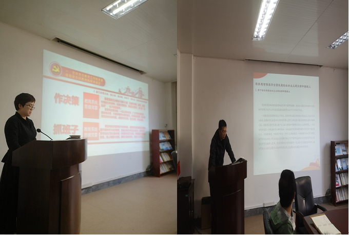会上,邱金英带领与会人员集体学习了《习近平总书记教育重要论述讲义》第一讲的内容,党总支副书记张家润带领学习了第二讲的内容,并围绕习近平总书记近期重要讲话精神、近期党中央召开重要会议精神、省委主要会议及相关文件精神的相关内容进行了专题学习。邱金英对“基层党建制度落实年”重点任务自查、“不忘初心、牢记使命”各支部问题检视清单整改情况、《习近平总书记教育重要论述讲义》下一阶段学习安排做了进一步的安排部署。在研讨交流环节,邱金英、霍忠明两位同志就本次学习内容交流心得体会。