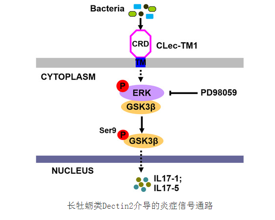 白介素17s(IL17s)是一类促炎细胞因子,凝集素Dectin2介导的信号通路可以调控其合成。近年来,越来越多的研究表明低等无脊椎动物中也存在IL17等炎症因子,并发现它们在免疫和炎症反应中均发挥重要作用。孙洁洁在长牡蛎中鉴定了类似高等动物Dectin2的分子CLec-TM1,进一步研究发现该分子在识别病原菌后,能够激活下游的胞外信号调节激酶(ERK)-糖原合成酶激酶-3β(GSK3β)信号通路,进而促进IL17s的合成。该成果为进一步研究低等无脊椎动物炎症发生机理提供了重要参考。