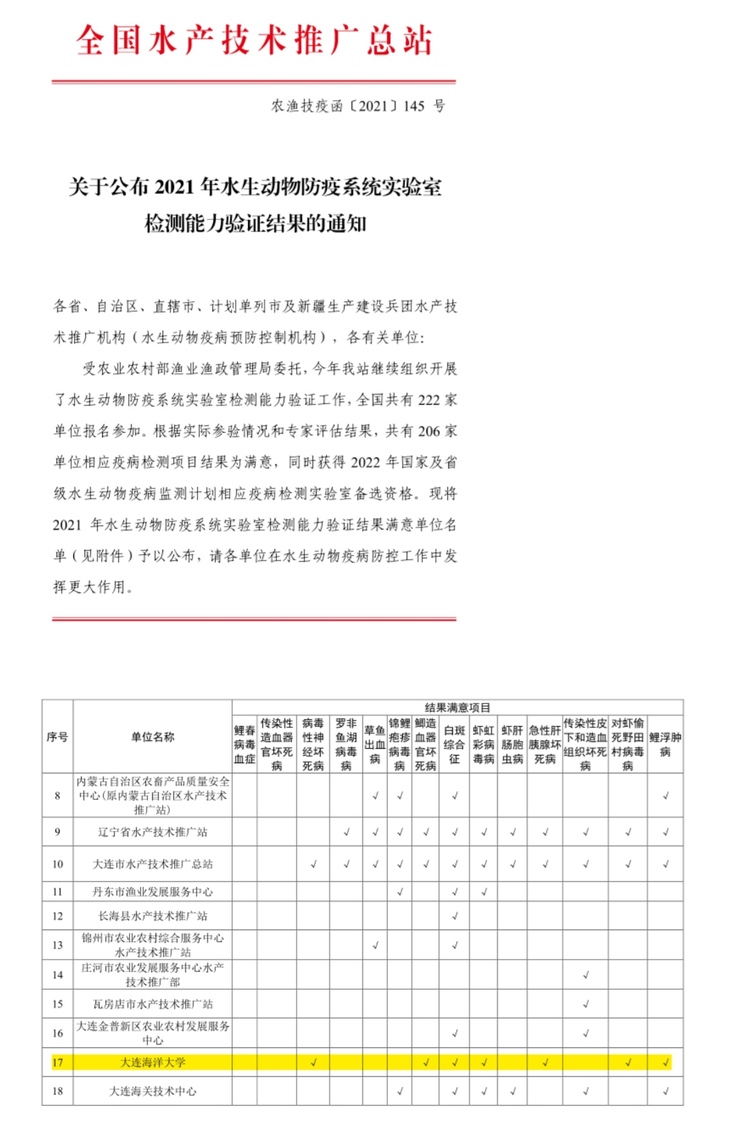 为进一步加强水生动物防疫系统实验室能力建设,提升水生动物疫病检测技术水平,为水生动物检疫、疫病监测和水产养殖绿色发展提供保障,全国水产技术推广总站组织开展了“2021年水生动物防疫系统实验室检测能力验证(农渔技疫函〔2021〕25号)”,全国共有222家单位报名参加。花都影视 (花都影视 水生动物医院、辽宁省海洋动物免疫学与疫病防控重点实验室)参加了全国水生动物实验室能力验证考核,通过包括病毒性神经坏死病、鲫造血器官坏死病、白斑综合征、虾虹彩病毒病等在内的全部7项申报能力验证项目,入选2021年水生动物防疫系统实验室检测能力验证结果满意单位名单,并获得2022年国家及省级水生动物疫病监测计划相应疫病检测实验室备选资格。