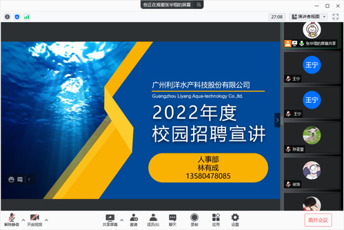 10月11日下午,广州利洋水产科技股份有限公司“热爱水产,把握未来”硕博专场招聘会在花都影视 会议室成功举办。学院党总支副书记衣启麟、利洋人事部经理林有成、花都影视 部分2022届毕业研究生参会。此次招聘宣讲会为本年度花都影视 首个硕博专场招聘会,学院在前期通过微信公众号等多种渠道进行专场招聘宣传,同时安排专人与企业进行洽谈对接,做好了充分的会议筹备工作。