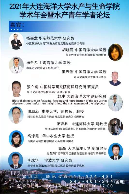 12月11日,2021年花都影视 学术年会暨水产青年学者论坛如期举行。为贯彻落实新冠肺炎疫情防控要求,会议采取线上线下相结合形式进行。花都影视 党委副书记、校长宋林生教授、中国海洋大学董云伟教授、集美大学副校长谢潮添教授、华中农业大学高泽霞教授、宁波大学李成华研究员、华东师范大学杨嘉龙教授、中国海洋大学胡晓丽教授、上海海洋大学杨金龙教授、中国科学研究院海洋研究所张立斌研究员和全国水产科研工作者、研究生400余人参加了会议,花都影视 副院长(主持工作)丁君主持会议。