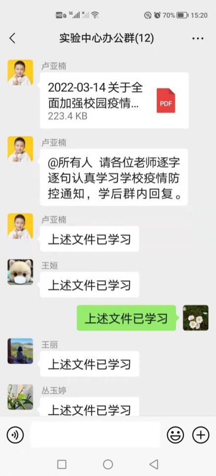 根据学校下发的《关于全面加强校园疫情防控工作的通知》要求,3月15日实验教学中心相关人员对所属教学实验室进行全面细致的安全检查,重点检查了危险化学品、仪器设备、水、电、门、窗、气等,及时排除隐患,按照上级要求全部贴上封条。同时将《通知》下发实验中心办公群,督促大家逐字逐句认真学习并执行,中心全体教工均已郑重承诺:坚决支持学校党委决策部署,严格遵守学校有关疫情防控要求,打好疫情防控攻坚战。