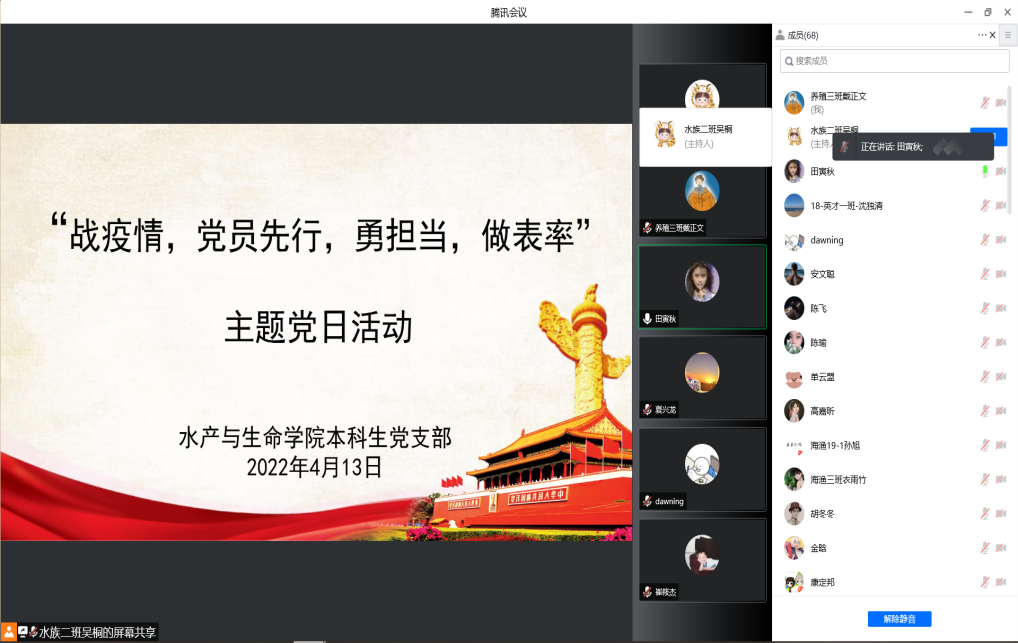 4月13日,学院本科生党支部通过线上召开“战疫情、党员先行,勇担当、做表率”主题党日活动,学院本科生党支部69名师生党员参加会议,本次会议由党支部书记王建东主持。