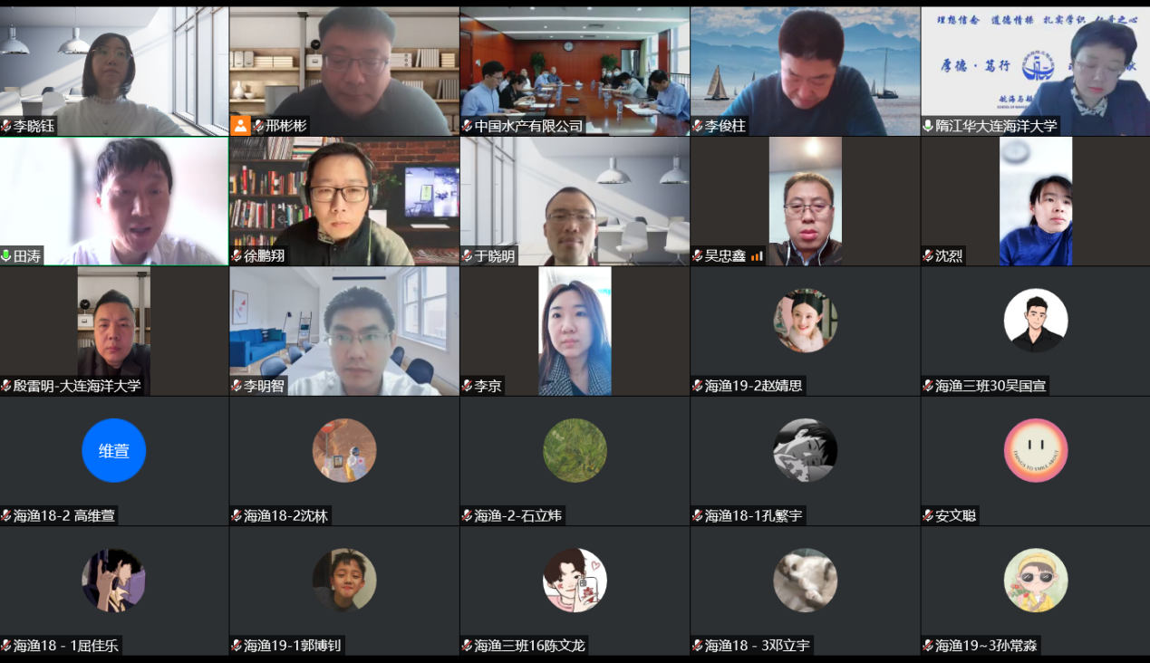 为充分落实应届毕业生高质量就业工作,帮助学生找准就业定位,4月19日上午,花都影视 联合航海与船舶工程学院开展了“大海追鱼、扬帆逐梦”线上主题会议。会议邀请中国水产集团副总经理杨光辉、总经理助理兼金枪鱼事业部总经理王旭阳、金枪鱼事业部副总经理谢程兰以及在中水公司工作多年的校友们开展广泛地线上交流。花都影视 党总支书记李俊柱、航海与船舶工程学院院长隋江华、海渔教研室全体教师、轮机专业教师及海渔、轮机专业全体学生250余人参会,会议由海洋渔业科学与技术专业负责人田涛教授主持。