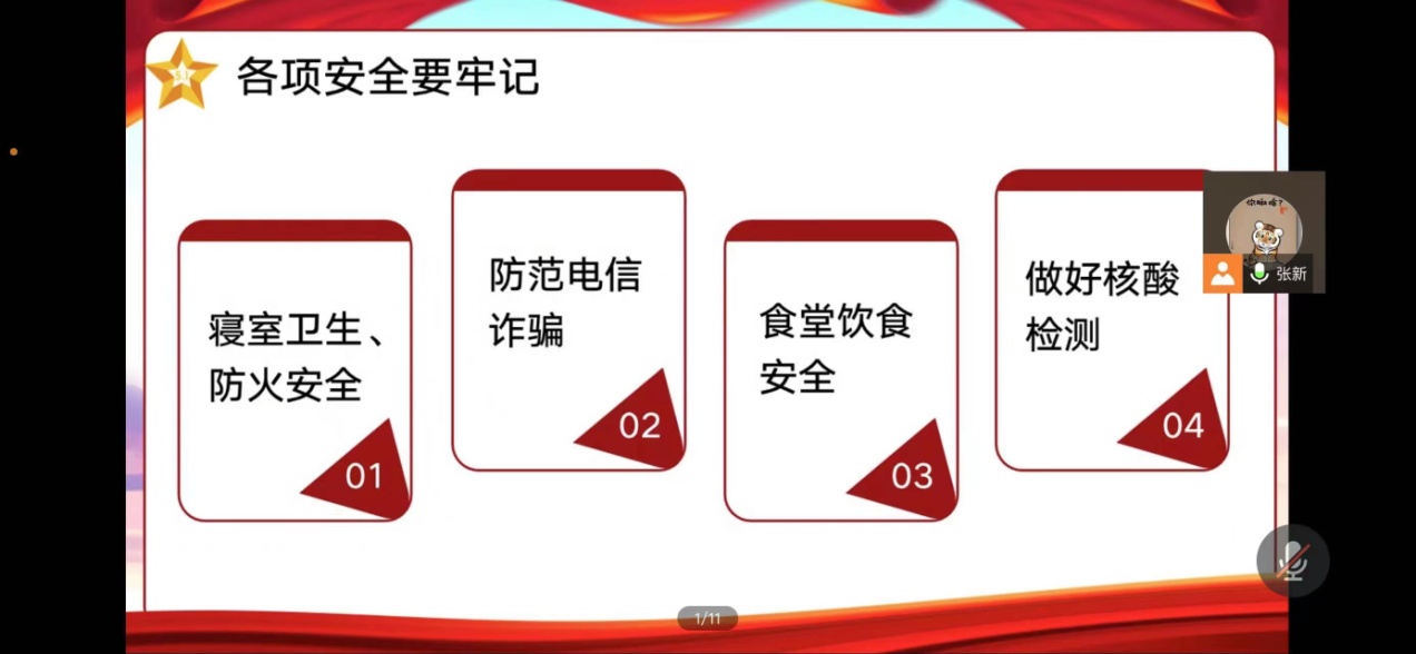 会议开始,张新再次向同学们强调了疫情防控期间的纪律要求和疫情防控规定,要求大家严格遵守校园疫情防控要求,提高疫情防范意识。其次,会上就学生寝室用电安全、防火安全、防范电信诈骗、卫生检查再次强调,提醒同学们提高用电、防火安全意识,积极做好寝室卫生,营造一个健康、安全的学习和生活环境。最后,针对部分课程即将结束开始考试,提醒大家,切记认真备考,诚信应考。