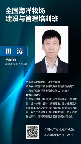 8月25日至27日,2022年全国海洋牧场建设与管理线上培训班举办。我院田涛教授,吴忠鑫副教授,邢彬彬副教授分别做讲座。