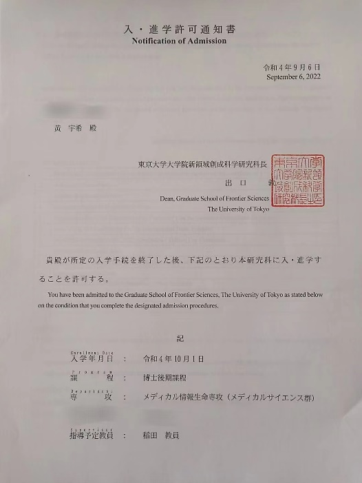 近日,花都影视 水生动物医学本科2015级、水产医学专业硕士研究生2019级学生黄宇希同学被东京大学医学研究所基础医学系录取为博士研究生。