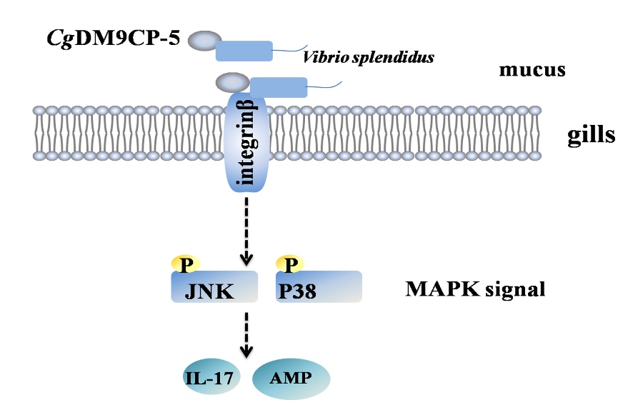 含DM9结构域蛋白(以下简称DM9CP)是近些年发现的一类新型蛋白,因其功能未知而成为研究者关注的热点。海洋生物学与生物技术实验室在2016年首次确认了贝类DM9CPs可以作为新型的模式识别受体识别和结合病原相关分子模式,且其对甘露糖的结合活性相对较强。实验室最新的研究表明,长牡蛎CgDM9CP-5能识别并结合灿烂弧菌,与血淋巴细胞膜表面的粘附分子CgIntegrinβ结合,激活下游MAPK磷酸化级联反应,进而调控炎症因子IL17s和抗菌肽defensins的表达。该成果为深入探索贝类新型模式识别分子介导的免疫应答机制提供了重要参考。