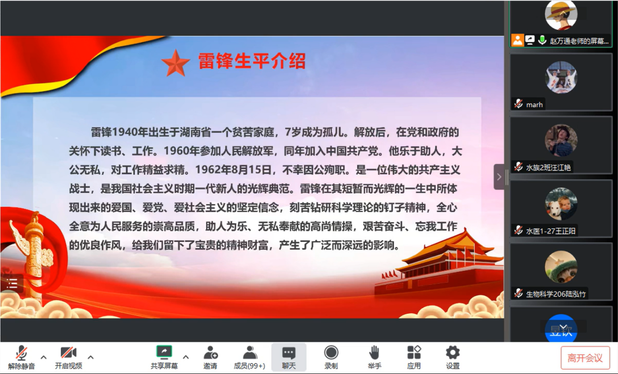 会上,辅导员赵万通首先介绍了雷锋的生平,随后列举了雷锋的相关名言,解释了传承雷锋精神的三个道理,最后深入的阐述了新时代大学生如何学习和传承雷锋精神。