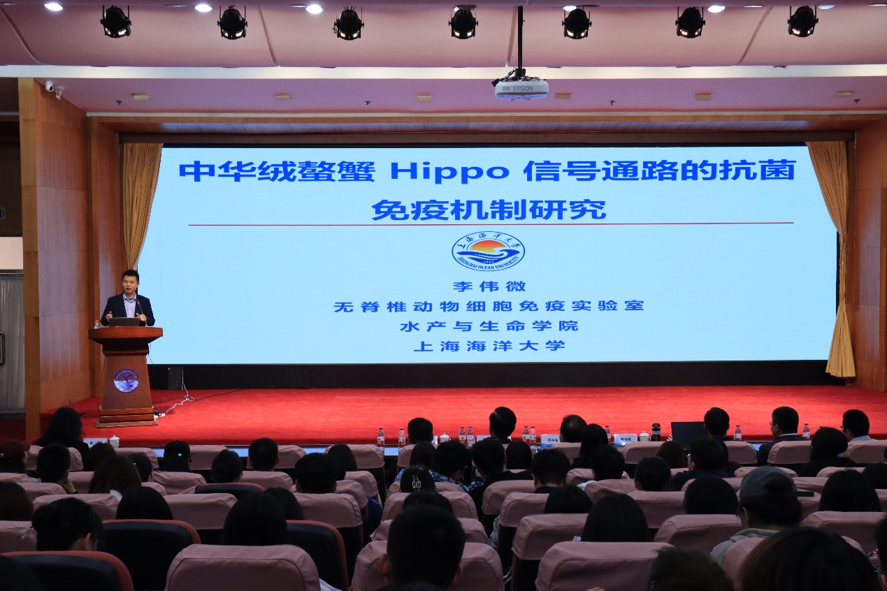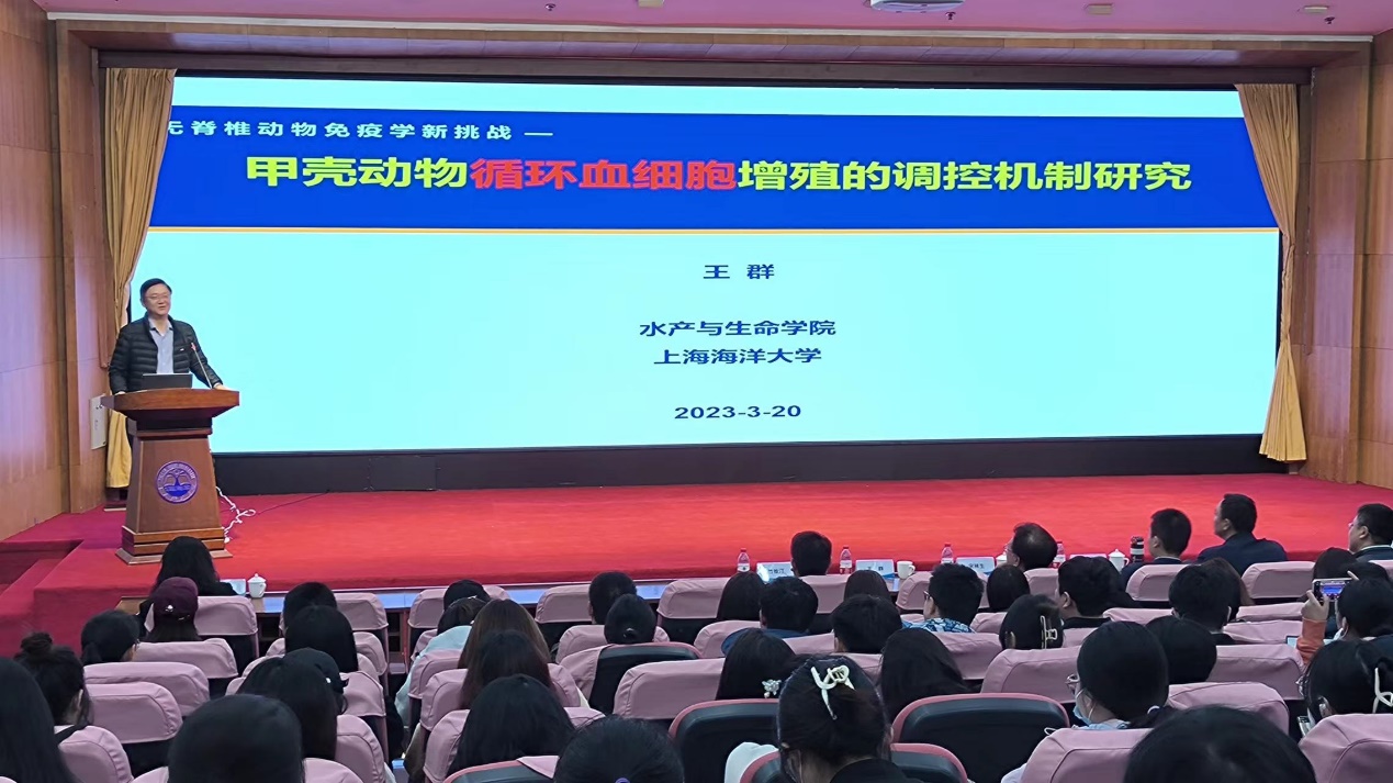 王群以《甲壳动物循环血细胞增殖的调控机制研究》为题在图书馆报告厅为我校师生作报告,他就甲壳动物造血干细胞的功能、介导增殖的作用机制以及免疫致敏等方面作了详细阐述。李伟微作了题为《中华绒螯蟹Hippo信号通路的抗菌免疫机制研究》的报告,主要从中华绒螯蟹的Hippo信号通路入手,阐明了Yorkie转录因子介导的抗菌免疫机制。二位教授的报告图文并茂、丰富充实,我校与会师生就报告内容与二位教授进行了热烈的交流与讨论。