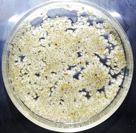团队与獐子岛集团股份有限公司在獐子岛原良种场联合开展紫石房蛤健康苗种培育关键技术研究。针对目前紫石房蛤人工苗种短缺的现状,开展环境因子对紫石房蛤幼虫与稚贝生长发育影响研究,建立了一套适合我国北方海域的紫石房蛤人工苗种繁育技术,成功培育1.5 mm以上紫石房蛤苗种200余万粒(图5)。