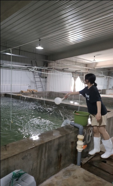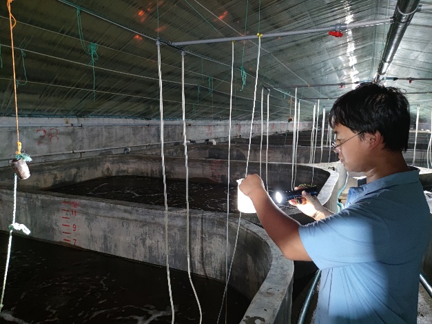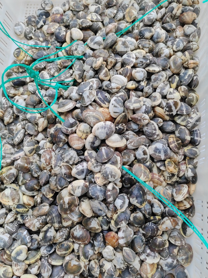 团队与莱州明波水产有限公司合作,在山东招远、昌邑等地开展土著蛤仔良种选育(图2、3)、室内苗种规模化繁育及中间培育池塘水质调控技术研究,累计培育优质本地蛤仔苗种50亿粒,为蛤仔苗种稳产增收提供技术保障。