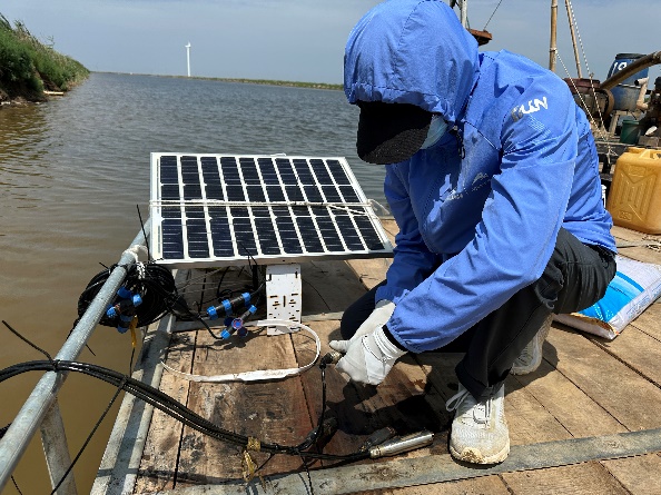 团队与丹东东港市渔业渔民渔船管理局在丹东东港市双峰岛蛤仔中培池塘安装养水机调控池塘水质,降低了夏季池塘表底层出现温跃层及盐跃层给蛤仔苗种中间培育带来的潜在风险(图4)。