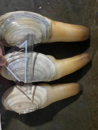 团队与大连上品堂海洋生物有限公司在庄河石城岛开展象拔蚌苗种繁育技术成果转化应用,并选育能够在我国北方海域安全度夏的壳长>1 mm的象拔蚌稚贝5万粒(图6)。
