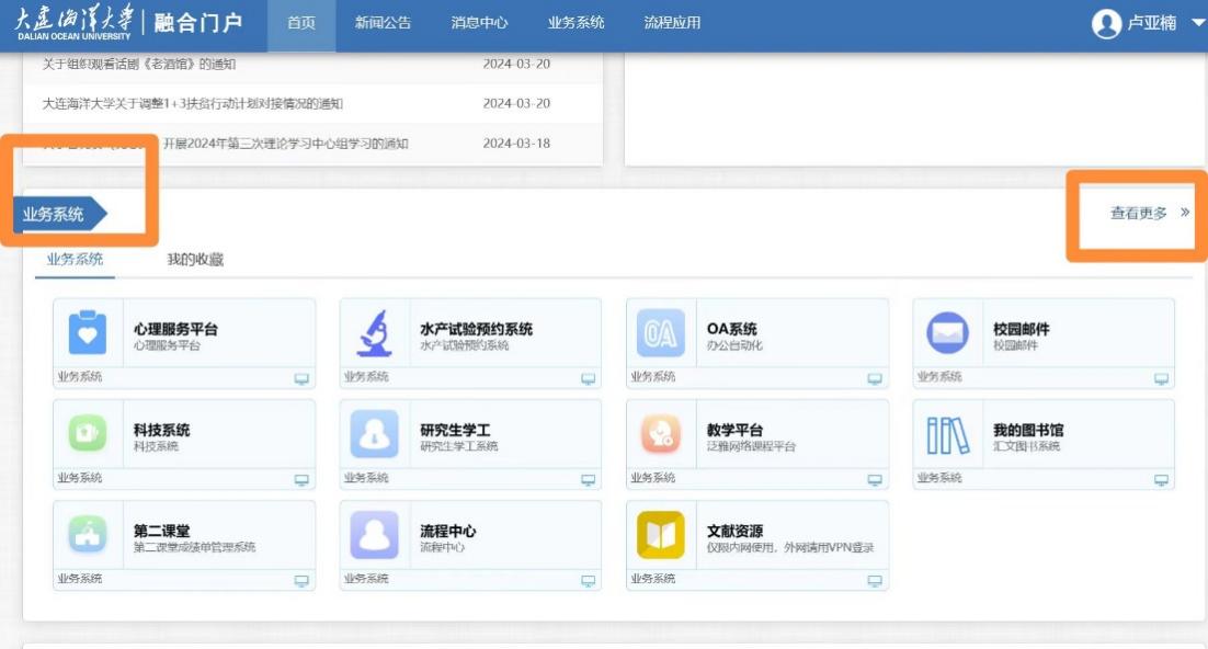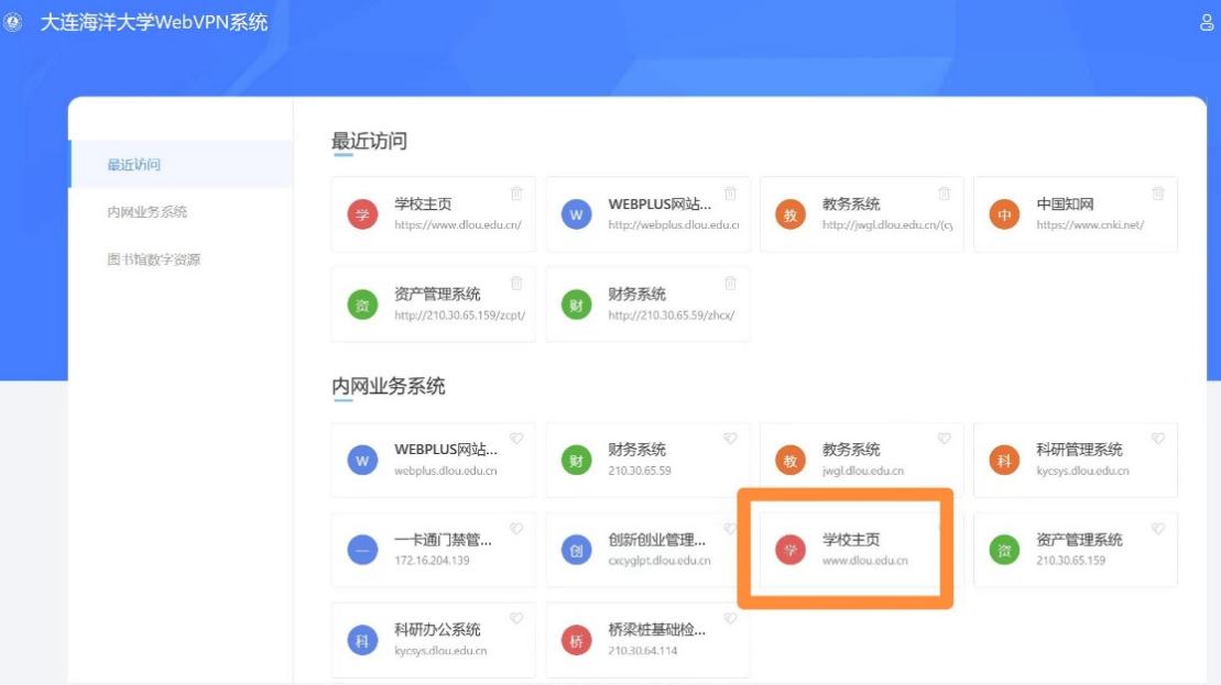 通过首 页 的融合门户进入业务系统(查看更多),找到“Web VPN”入口,然后进入内网业务系统,通过“学校主页”进行内网操作。