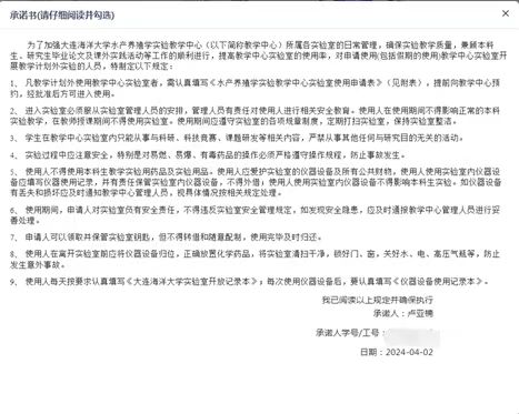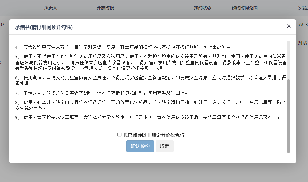非假期时间段选“教学计划外使用”,假期选“假期使用”,然后认真阅读相关使用规定,在承诺书下方勾选“已阅读以上规定并认真执行”,确认预约。