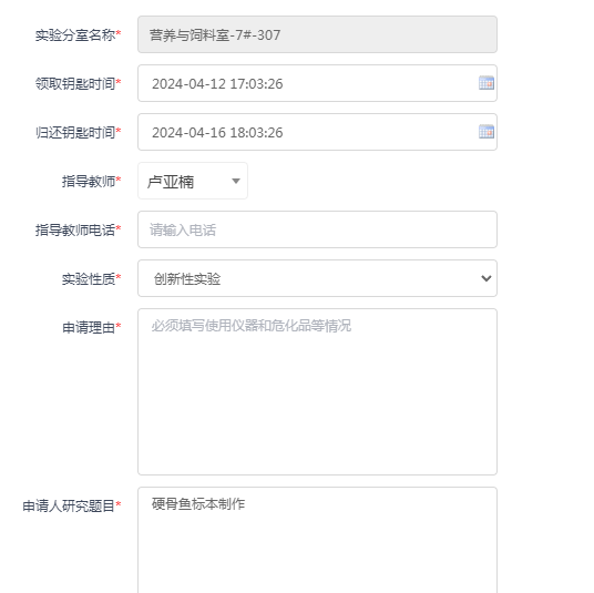 申请理由界面,按要求填写,一定写明需要使用哪些仪器设备和危化品等,提交申请,弹出“预约成功”。注意姓名和手机号要匹配