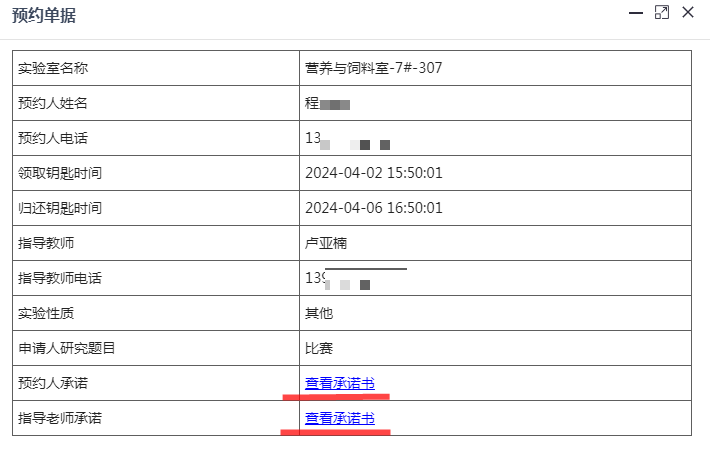 教师审核:学生提交预约后,呈现“待审核”状态。联系指导教师进行审核,指导教师务必知晓学生的预约详情,认真阅读承诺书,查看无问题通过审核,有问题则驳回。