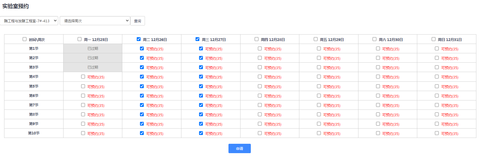 选择该实验室的时间段进行预约,可下拉周次栏选择时间段,然后具体可按课时选择,也可按全天选择,然后点击“申请”