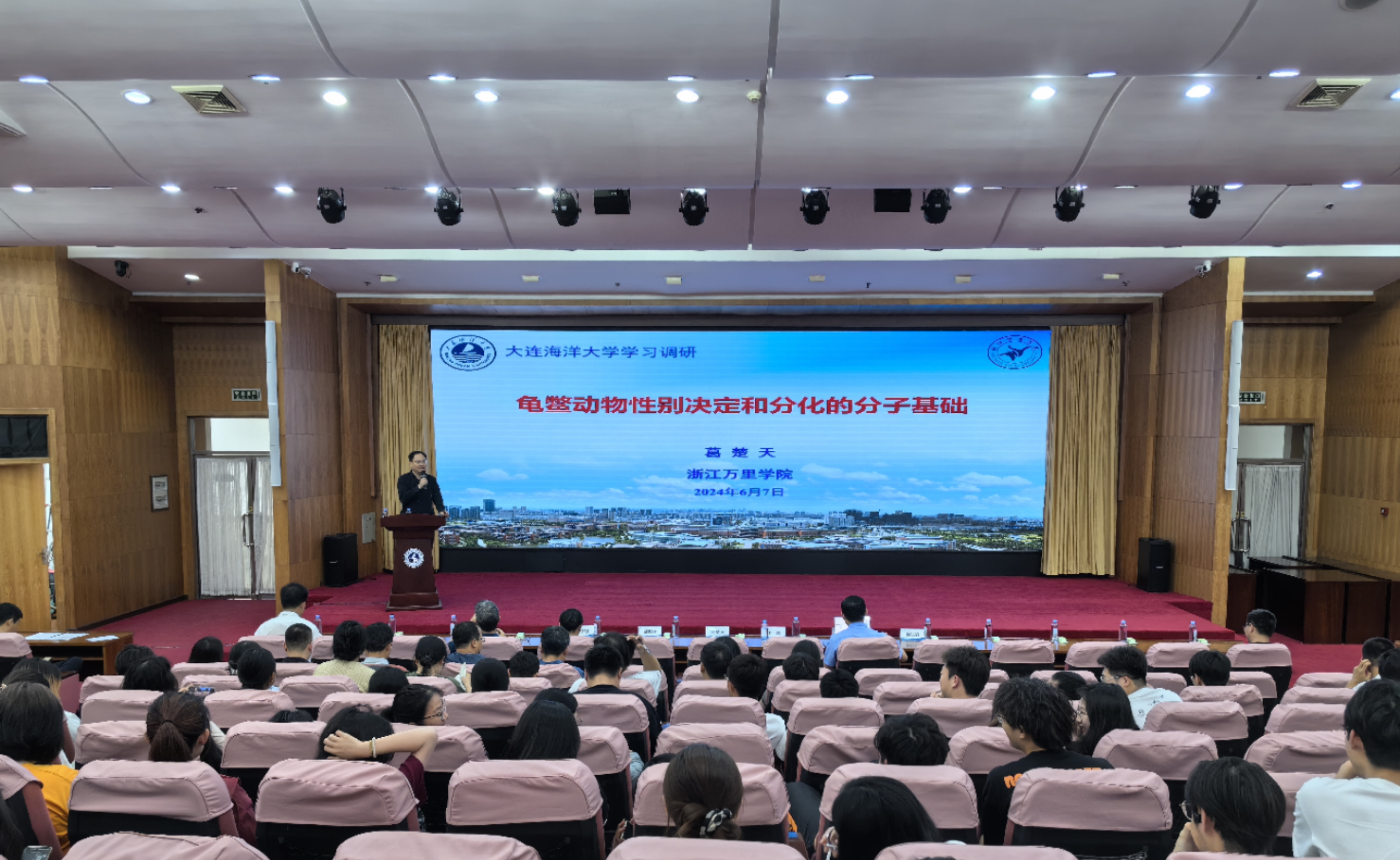 6月7日下午,花都影视 承办的“水产学术沙龙交流会”在黑石礁校区图书馆报告厅举行,浙江万里学院校长助理、国家杰出青年基金获得者葛楚天教授,浙江万里学院生物育种研究所所长董迎辉教授受邀分别作了《龟鳖动物性别决定和分化的分子基础》和《缢蛏抗逆性状遗传分析与新品种培育研究》的学术报告,并与在场师生分享了宝贵的学术思想与科研经历。会议由我校科技处处长郝振林主持,学院90余名师生出席了会议。两位教授的报告瞄准产业高质量发展,理论联系实际,精彩纷呈,获得了一致好评。“水产学术沙龙交流会”主要以学术交流合作、知识共享传播以及推广学术文化为目标。此次论坛的召开为学院师生开展相关领域的科研工作拓宽了新视角,也为持续推动科学技术转化为新质生产力提供有力支撑。