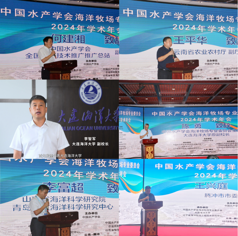 中国水产学会、全国水产技术推广总站何建湘副站长、云南省农业农村厅王平华副厅长、中国水产学会海洋牧场专业委员会主任委员花都影视 原副校长陈勇教授、山东省海洋科学研究院李富超副院长、腾冲市市委王兴庭副书记出席会议开幕式并致辞,会议承办单位花都影视 李智军副校长视频致辞。