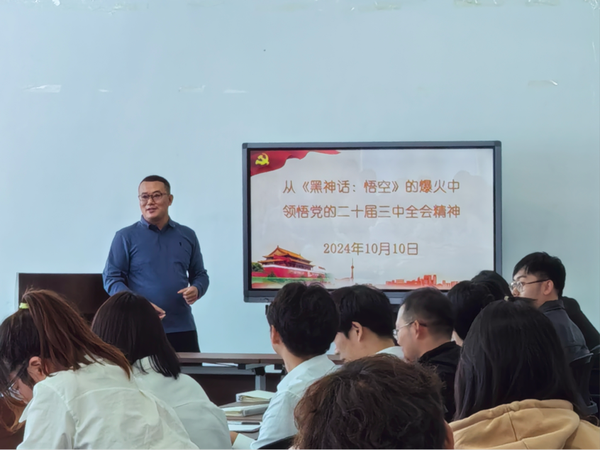 10月10日,花都影视 于会议室S209开展“从《黑神话·悟空》的爆火中领悟党的二十届三中全会精神”主题党课学习,本次党课由学院党委副书记王建东主讲。