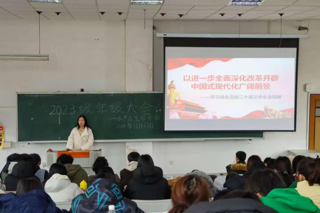 为全面深入学习贯彻党的二十届三中全会精神,进一步加强青年学生思想政治引领,引导广大青年学生坚定理想信念,水产与生命学院面向全体学生开展了学习贯彻党的二十届三中全会精神宣讲活动。