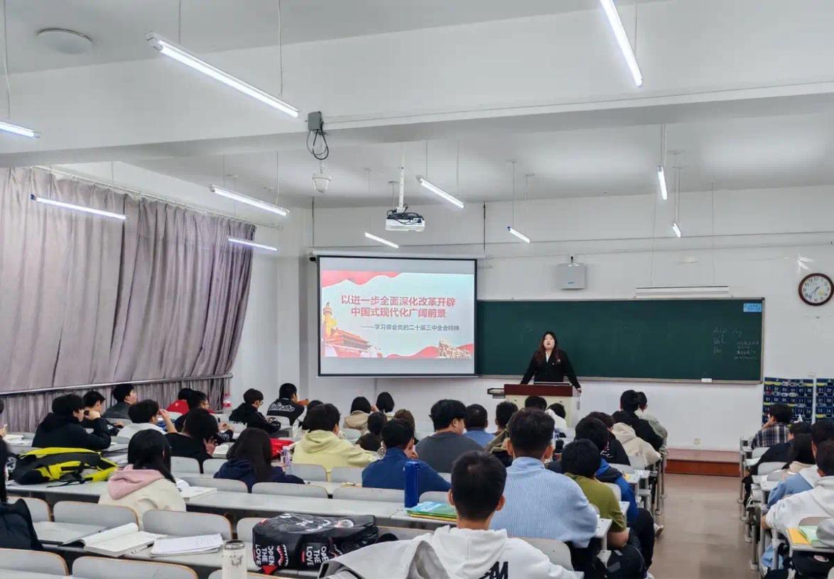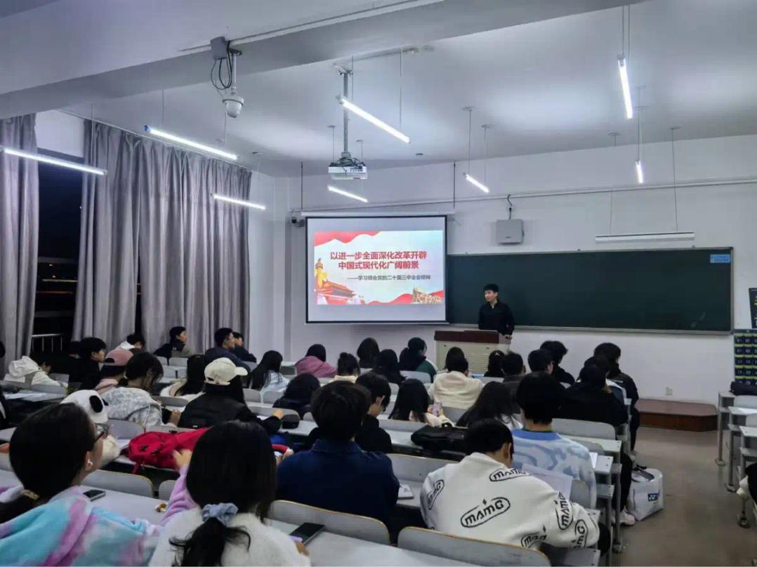 同时,为强化学习效果,深入推动党的创新理论落地生根,各年级辅导员结合青年学生特点,紧密联系学校和学院实际,面向学生进行党的二十届三中全会精神宣讲,引导学生们坚定马克思主义信仰、中国特色社会主义信念、中华民族伟大复兴信心,立报国强国大志向、做挺膺担当奋斗者。此外,学生党员利用班会时间,到各个班级与同学们进行党的二十届三中全会精神的宣讲和交流研讨。