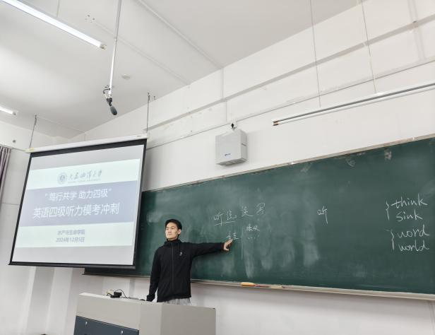 此次活动邀请到了四级听力高分通过的水族科学与技术专业2023级1班邹浩分享听力备考经验。活动中,邹浩结合自身经验对四级考试听力部分进行了讲解与分析,详细介绍了自己的备考策略和考试技巧,他强调了日常听力训练的重要性,并指出听与说的结合才能有效提升听力能力。同学们纷纷表示受益匪浅,对英语四级听力考试有了更深入的理解和把握。