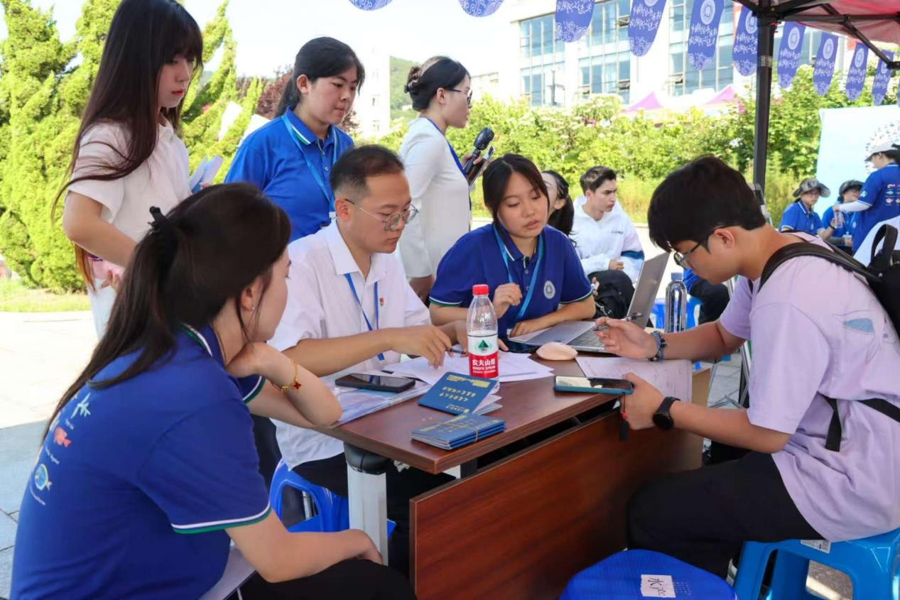 “潮起东方,逐梦深蓝”。迎新现场处处洋溢着热烈氛围,彩旗迎风招展,师生笑语盈盈。学院精心为每位新生准备了寓意深远的纪念礼物,以“以梦为马、不负韶华”的美好祝愿,迎接新学子的到来。清晨时分,校园已热闹非凡,身着象征海洋的蓝色文化衫的志愿者们,化身“暖心向导”:他们穿梭在各个迎新点位,耐心指引报到路线、细致解答入学疑问、主动协助搬运行李、全力维护现场秩序。点点滴滴的付出汇聚成温暖的暖流,让初到校园的新生们在陌生环境中感受到家的亲切,第一时间与学院建立起紧密的情感联结。